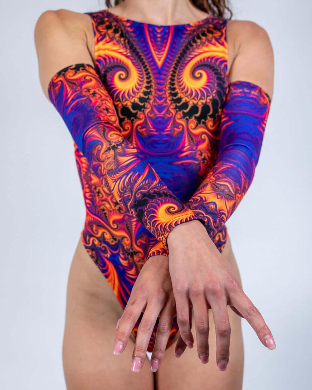Slide into full spectrum fierceness with the Radiance Arm Sleeves — your ultimate rave-ready accessory. Drenched in hypnotic fractal swirls of fiery orange, electric fuchsia, and deep indigo, these sleeves are pure energy in motion.