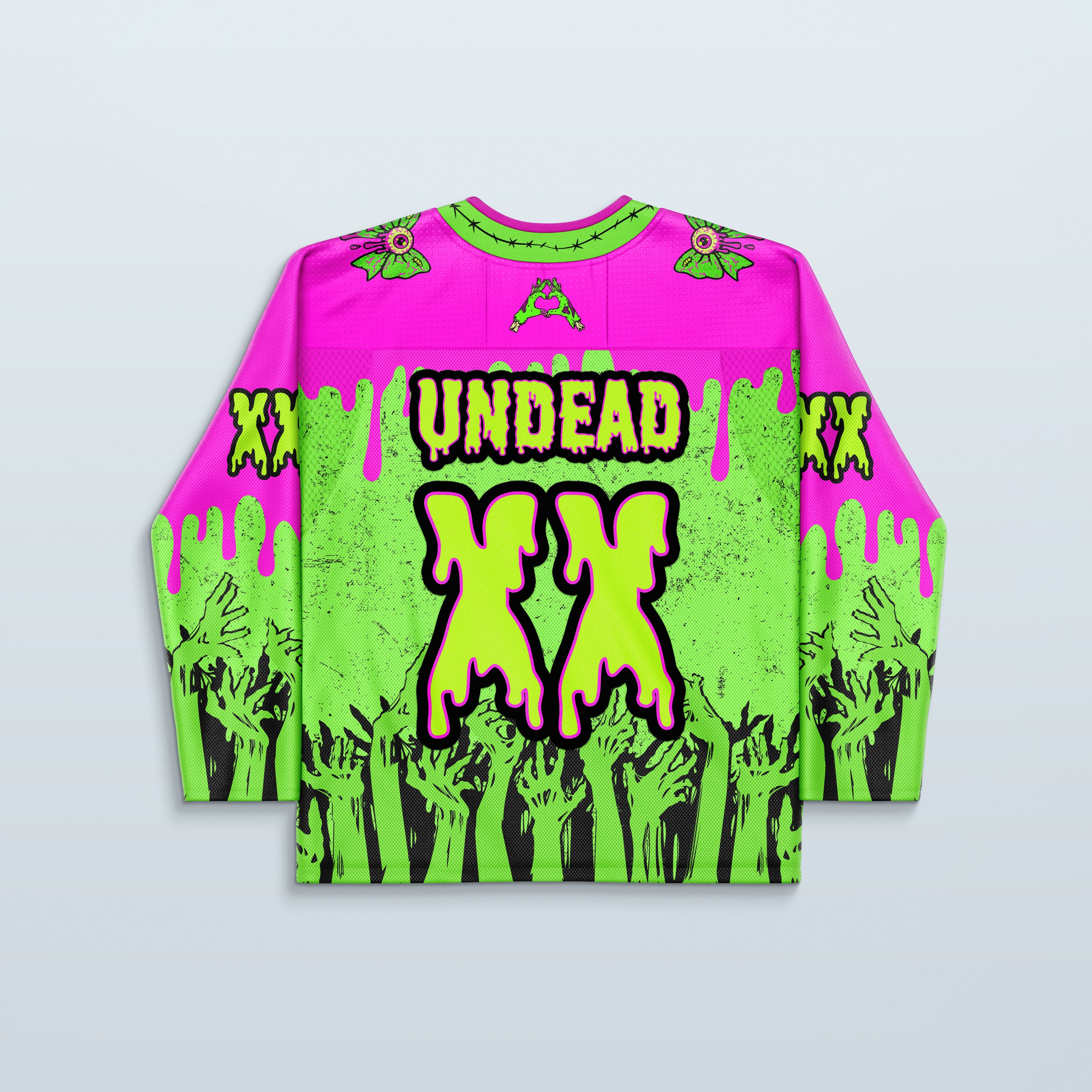 For the babes who’d survive the apocalypse in platform boots, this one’s for you. Neon green and hot pink with black details scream undead glam. This jersey fuses neon colors with zombie hand silhouettes clawing their way up from the depths. A heart-shaped brain anchors the design with “Zombae” scrawled across it, while stitched eyeballs and radioactive drips add to the total mayhem.