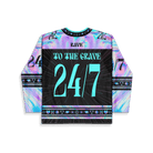 This isn’t your average jersey—it’s a resurrection-ready rave relic. The Rave To The Grave Hockey Jersey is a limited edition drop that fuses metallic oil-slick vibes with a “live fast, rave forever” mentality. Featuring an iridescent pastel palette, skull graphics, and name plates “Bury Me at the Rave” and “24/7 To the Grave,” this piece is for the ride-or-dies who never miss a set.