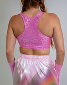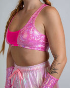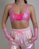 Introducing the Bubble Gum Holo V Free Top, a must-have for any rave lover. This pink holographic top features a mesmerizing mesh insert, perfect for standing out in the crowd. Add a touch of sparkle to your outfit and shine all night long.