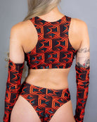 This red and black geometric top is designed for raves with a keyhole cutout for added style.
