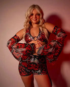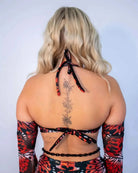 The Lacewing O-Ring Top is a seductive twist on a classic rave halter. With its eye-catching iridescent shimmer and daring O-ring centerpiece, this top brings the heat whether you're on the dancefloor or deep in the underworld of a warehouse set. The striking Lacewing print blends butterfly wings with fiery Halloween vibes—think enchanted forest meets midnight mischief.