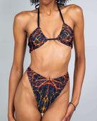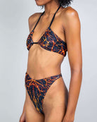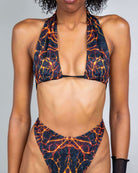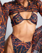 Unleash your inner fire with the Magma Twist Tie Bandeau Top. This unique rave top is made with a twist tie design that mimics the fiery flow of lava. Get ready to turn heads and light up the dance floor with this one-of-a-kind top.