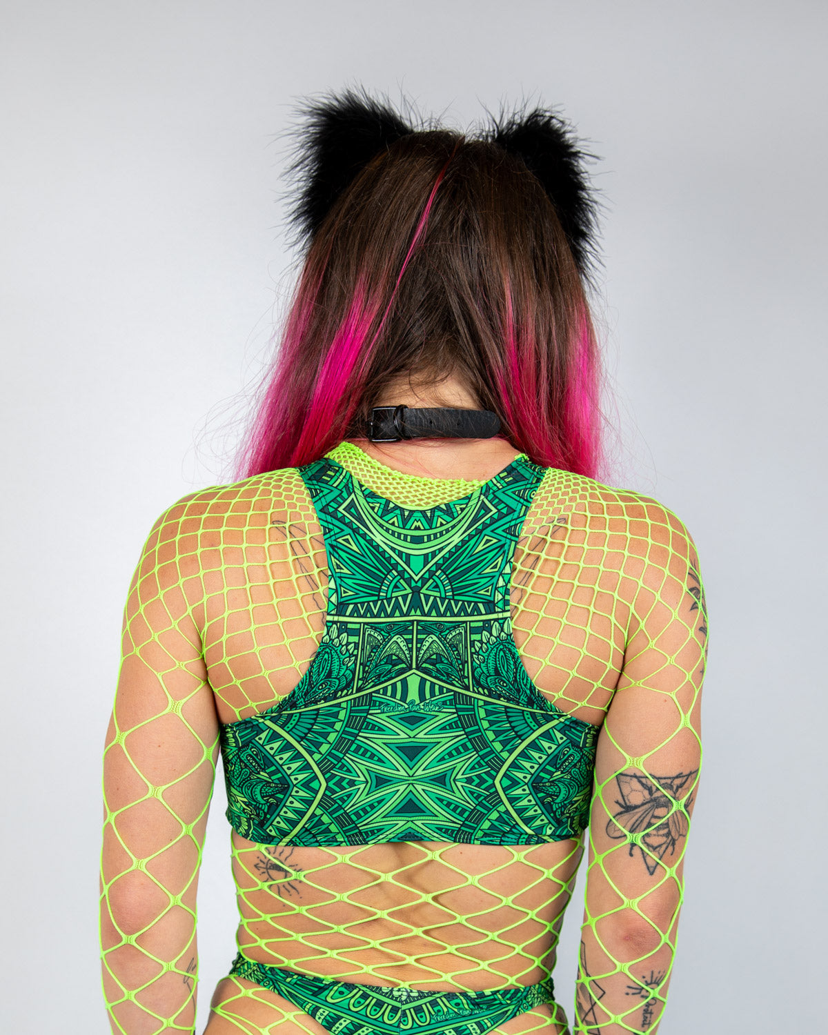 Elevate your rave look with the Dominion Teaser Top, featuring a bold halter neckline and full chest coverage with a dramatic underboob cut. This piece blends futuristic festival flair with sleek, functional design. Crafted from our signature eco-stretch fabric, this top holds you in while letting your fit breathe. The vivid Dominion print — complete with sneaky little dinosaurs hidden in the details — brings a high-energy, playful vibe to any outfit.