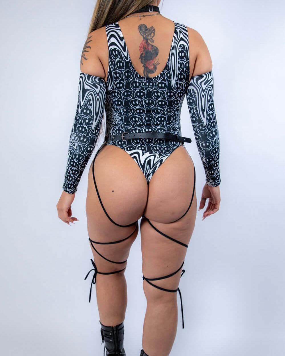 Elevate your style and make a statement with our Flutter Sideboob Bodysuit! This stunning bodysuit features a beautiful butterfly print and attached leg straps for added flair and detail. Perfect for adding a touch of unique, eye-catching style to any outfit.