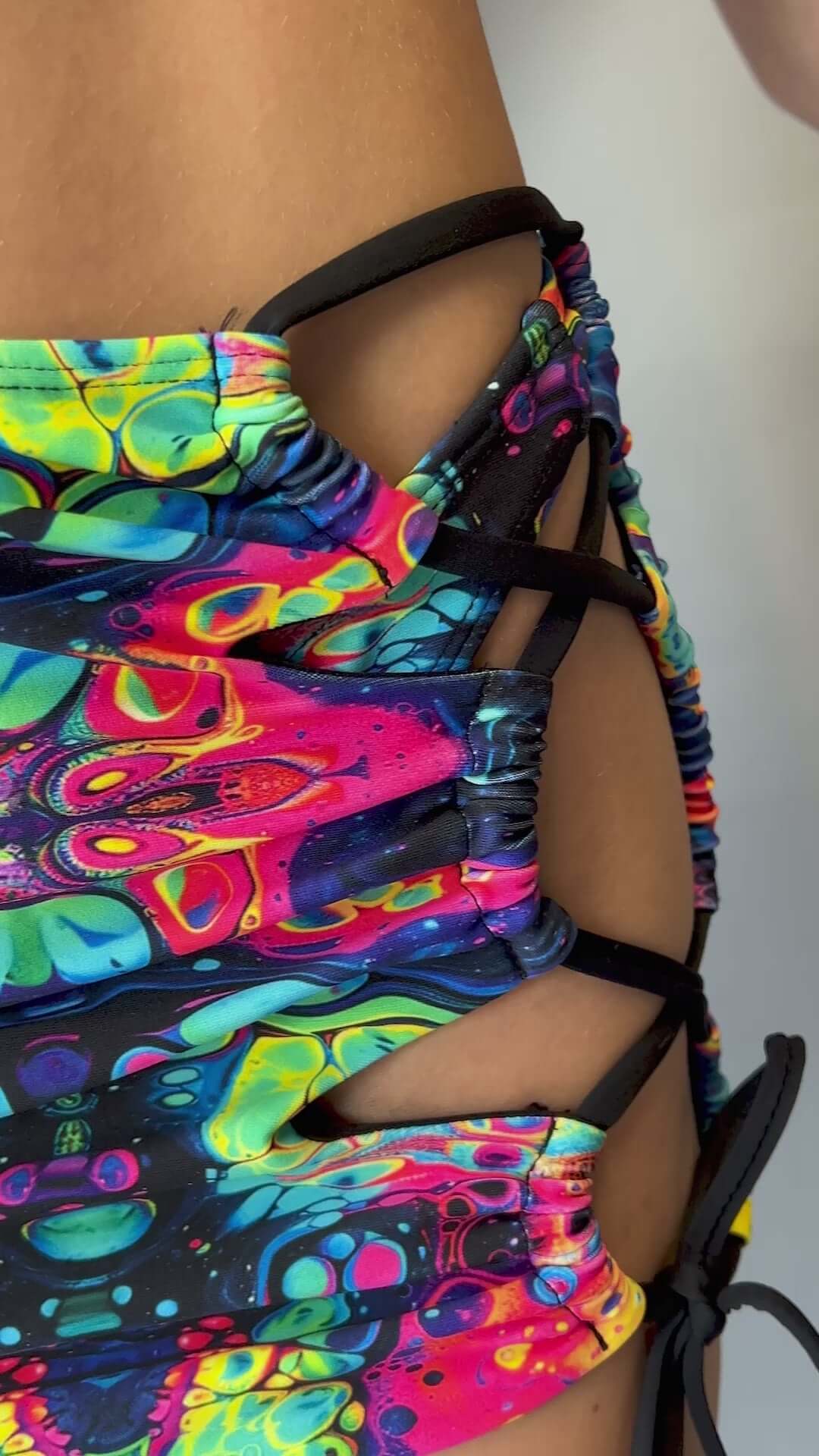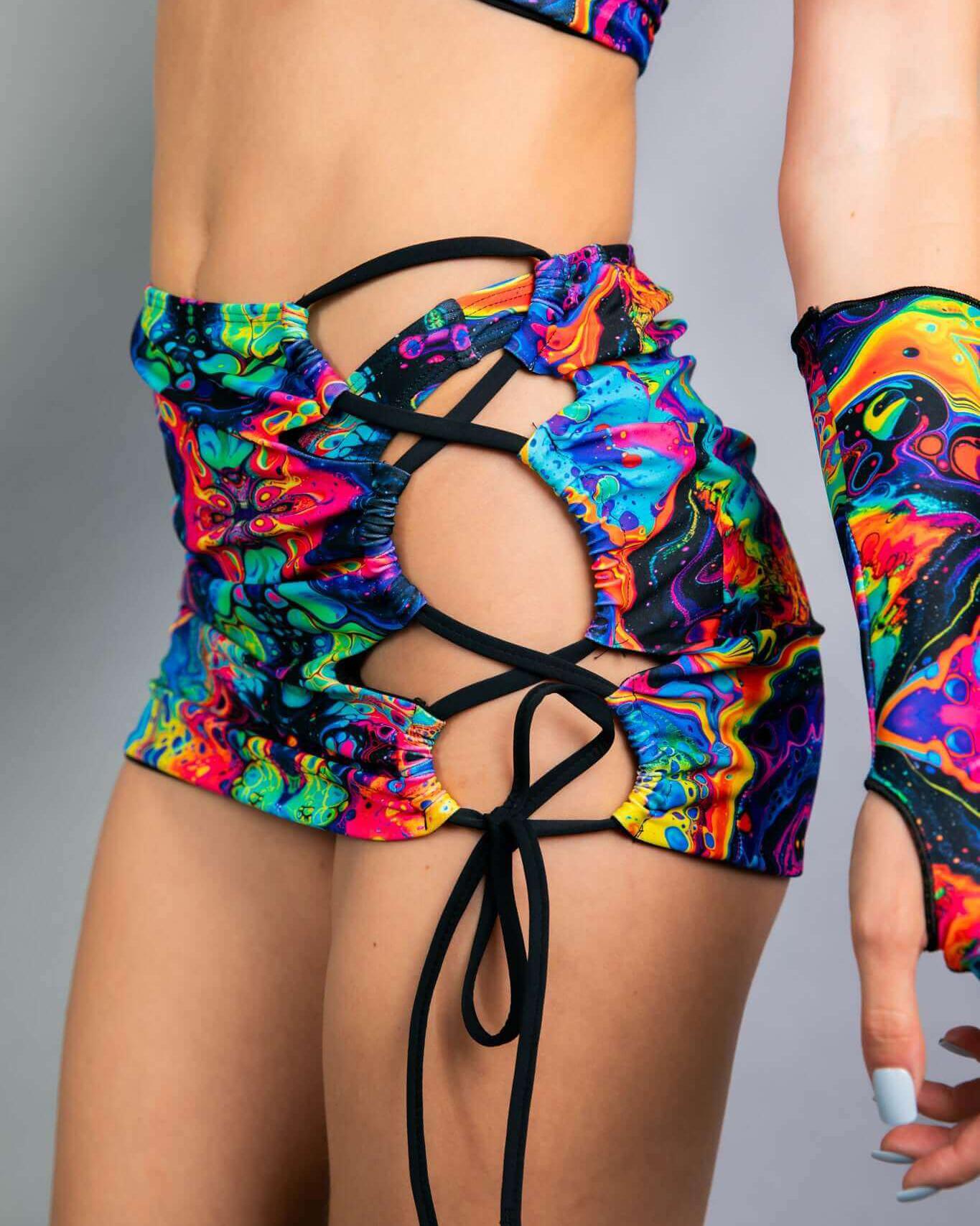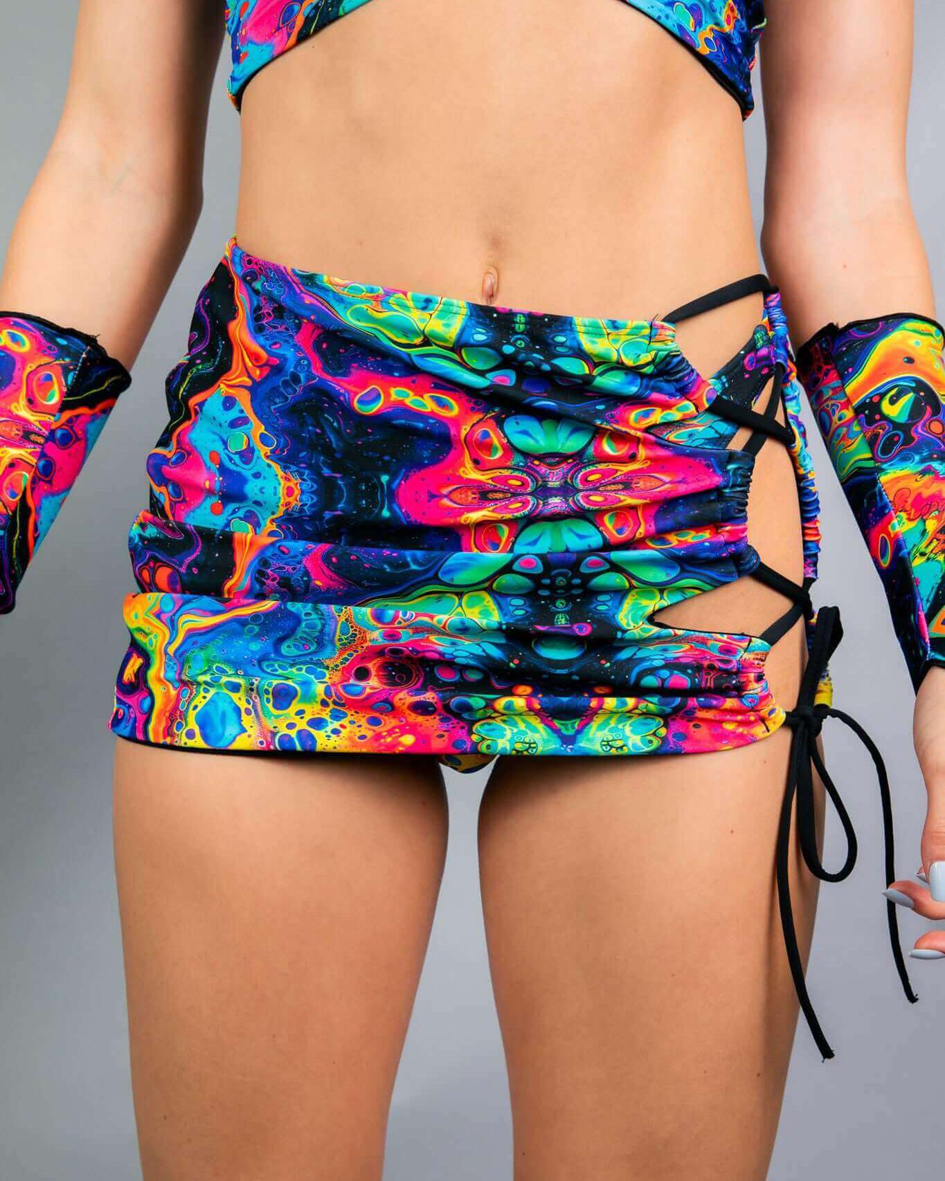 Get ready to rave in style with the Vivid Verano Mini Skirt. Featuring a vibrant rainbow trippy print and a lace-up design, this mini skirt will elevate your rave outfit to the next level. Be the center of attention and dance the night away with confidence in this must-have piece.